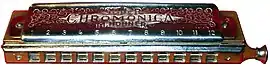 ![]() A 16-hole chromatic (top) and 10-hole diatonic harmonica | |