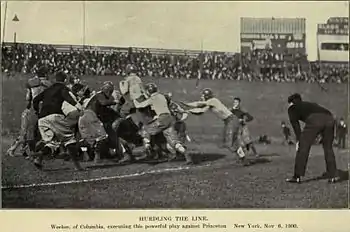 Returning a kick in the second half of Columbia's game against Yale, Weekes sprinted 50 yards to score a touchdown. During the run, he successfully thwarted the tackling attempts of several Yale players, including the team captain. Weekes's scoring play for Columbia marked the only points in a 5-0 shutout of Yale.[26] Columbia's surprise upset victory represented the first time in 28 seasons that a team other than Harvard, Princeton, or the University of Pennsylvania shut out Yale.[27] The 1899 victory also marked Columbia's first defeat of Yale in 24 years.[28]