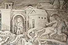 The ancient Assyrians called the city Huzirina.[15] Ḫarrānu was Hellenised to Kárrhai (Kάρραι)[16] in the Hellenistic period.[17] The Romans later Latinised the Greek name into Carrhae.[17][18] Due to the prominence of both Harran and Carrhae in historical literary sources, some scholars use the compound name "Carrhae-Harran" for the ancient city.[19] Under the Byzantine Empire, the city continued to be called Carrhae (Kάρραι) but was also sometimes referred to as Hellenopolis (Eλληνóπoλις),[16] "city of the [pagan] Greeks", in reference to the strong pagan traditions there.[3][9]