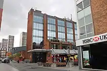 The town centre has undergone a new wave of redevelopment. In 2011, the one-way single lane section of Station Road was widened to allow two-way bus traffic.[41] The 11 storey luxury apartments of Bradstowe House was completed in 2016 after long delays.[42] Former office buildings on Lyon Road (including Coal House, once belonging to the National Coal Board) have been regenerated into new mixed use buildings in the 2010s, whereas on Pinner Road behind St George's centre a new eight storey development called Trident Point was built which includes a Morrisons supermarket opened in 2013.[43] The former post-office sorting building on College Road, next to the train station, remained vacant for some years until plans for a 19-storey skyscraper was approved by the council in 2015. The development, called Harrow Square, was partly completed with 318 apartments across four buildings in 2018.[44][45] It includes a bottom floor 1,450 square metres (15,600 sq ft) library still under construction which will replace the current Gayton Library on St John's Road.[46][47] The building next to it, formerly First National House,[48] has been refurbished into luxury apartments called The Hub.[49]