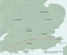 The Harrow Way (also spelled as "Harroway") is another name for the "Old Way", an ancient trackway in the south of England, dated by archaeological finds to 600–450 BC, but probably in existence since the Stone Age.[1][2] The Old Way ran from Seaton in Devon to Dover, Kent. Later the eastern part of the Harrow Way become known as the Pilgrims' Way in the 19th century: the latter was a route invented by Albert Way of the Ordnance Survey, who imagined it (without evidence) to have been a pilgrimage route ran from Winchester, Hampshire, via Farnham, Surrey, to Canterbury Kent.[3][4] The western section of the Harrow Way ends in Farnham, the eastern in Dover.