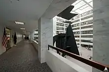 The atrium is dominated by the sculptural work Mountains and Clouds by Alexander Calder. The upper part of the work consists of a mobile, "Clouds", made from curved aluminum plates suspended from the roof on a shaft.[35] The largest section of the mobile measures roughly 43 by 32 feet (13.1 by 9.8 m),[36] and the entire mobile weighs about 4,300 pounds (2,000 kg).[37][38] Crystallization Systems, Inc. of New York manufactured the mobile.[39][40] A computer-controlled motor moves the mobile.[36][40]