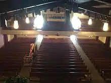 The main floor and balcony accommodate approximately 1,000 people in pew seating. To the rear and center of the balcony there is a sound booth with an excellent view of the stage. The stage itself is surprisingly large and it is currently rumored that it may be shortened in an effort to add more seating. The classrooms are known as "Hatch A," located just behind stage left, and "Hatch B" which is behind stage right. To each side of the stage there are double doors leading into side exit lobby areas. These lobbies also have the entrances to the classrooms and directly to the stage itself.
