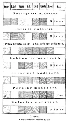 Out of these systems, Otto Titan von Hefner published some further hatching methods at table X of his above cited book, presenting hatching methods for some additional tinctures as well. Some additional tinctures had already appeared in the theory of heraldry in the early 15th century, which were then soon applied in practice. The German jurist and heraldist Eucharius Gottlieb Rink (1670–1746) introduced hatching for the gray (Eisen = iron) and proper (Naturfarbe). These hatchings (natürlichen Farbe, Eisenfarbe) were presented by Gatterer as well. He maintained that the first one is needless, but the second one has its own importance, because he had noticed himself that old armorials produced by heralds, at least in Germany, also made a difference between iron-colour (Eisenfarbe) and the white colour (weisse Farbe), when they omit the term Argent. He also recommended to study the work by Johann David Köhler titled Programma de auctoribus incisurarum, to learn about the origin of hatchings.[2] The German heraldist Christian Samuel Theodor Bernd (1775–1854) introduced hatching for some other tinctures such as Umbra (sienne, earth-color), Rotgelb (yellow-red, orange), Stahlblau (steel blue) and Blutfarbe (sanguine).