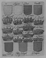 The French heraldist Imbert de la Phalecque and his Italian counterpart Goffredo di Crollanza claimed that the work of Philippe de l'Espinoy was the first one that adopted the hatching system applied in the blazon. His two-volume book was published in Douai in 1631 and in 1632 respectively. (A facsimile of l’Espinoy's book titled Recherche des antiquités et noblesse de Flandre was published in 1972.) This city, now in France, was then part of Flanders. The illustrations in this book include 1,121 escutcheons, standards and seals of armorial bearings, on wood, besides 58 copperplate illustrations that at first sight appear to have hatchings. If one however compares these "hatchings" with the descriptions, then one finds out that there isn't any system in it at all. For instance Gules is alternately indicated by horizontal or vertical or diagonal lines or is left blank. It seems l'Espinoy considered lines and dots merely as a sort of artistic additions which he put in at random. There is no hatching table at all.