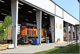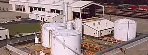The facility features several large fuel storage tanks, capable of holding thousands of gallons of diesel fuel. The facility moves 250,000 gallons of fuel daily and almost 7 million per month.[1] These tanks are connected to a network of pumps and hoses that allow trains to be refueled quickly and efficiently. In addition to fueling services, the facility also provides routine maintenance and repair services for BNSF locomotives and railcars.[3][1][2]