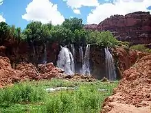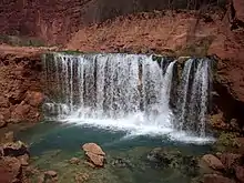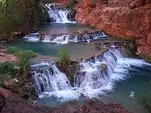 Flooding is common along Havasu Creek. A government report lists 14 "historic floods" from 1899 to 1993.[16] One such flood occurred on August 17, 2008, when the Redlands Dam on Havasu Creek burst after days of heavy rain. The floodwaters' threat to human life led local authorities to evacuate the village. Rescue crews airlifted about 400 people to safety.[17] Navajo Falls was bypassed in the flooding, Fiftyfoot Falls became more prominent, and Lower Navajo Falls was formed.[10][18]