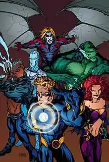 Multiple Man had contracted the Legacy Virus in Genosha and later chose to undergo a seemingly mystical healing effort.[26] Despite the procedure's previous success with Wolfsbane, curing her of her unnatural love for Alex, Multiple Man perished.[27] This hit Havok hard, as he felt responsible since Madrox was under his command. He left the team for Hawaii, where he and Polaris enjoyed a romantic honeymoon until Malice, Mr. Sinister and The Nasty Boys showed up.[28] Reinforcements helped Havok and Polaris survive the villains.[29] Shortly afterward, Strong Guy suffered a heart attack and ended up in stasis,[30] and Wolfsbane left to be with her foster mother.[31]