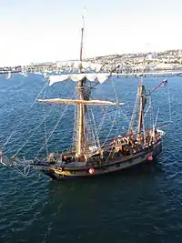 The Hawaiian Chieftain was commissioned by Laurence H. Dorcy, Jr., designed by nautical architect Ray Richards, and built by Lahaina Welding Co. Ltd. on the island of Maui; Drake Thomas was the ship's builder. Lofting, initial hull framing and partial hull plating was performed by Morgan Davies (until his departure from the project in December 1986).Completion of hull welding (including bow and topside plating) was performed by ship welders Ken Bear, Bill Purvis, Lionel Clemons and Oliver Pagttie. Additional expert tradesmen were hired for the rigging (George Herbert/Ivan Hope), ship's carpentry, machinery (Alan Fleming, Carl Geringer) and electrical installation (Neil Willmann). Master Mariner Des Kearns played a key role as a Project Director from early 1987 until launch in June 1988.[2] Under its paint, her bowsprit bears the inscription "Lahaina Welding Co." Her maiden voyage was to French Polynesia on April 1, 1990 and arriving in Papeete on April 20, 1990. She was based in Sausalito, CA for many years, sailing up and down the coast with the Lady Washington on Voyages of ReDiscovery, providing hands-on history programs teaching 4th and 5th graders about the exploration and trade along the West Coast in the 1790s.