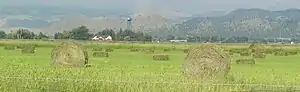 Modern hay production often relies on artificial fertilizer and herbicides. Traditionally, manure has been used on hayfields, but modern chemical fertilizers are used today as well. Hay that is to be certified as weed-free for use in wilderness areas must often be sprayed with chemical herbicides to keep unwanted weeds from the field, and sometimes even non-certified hayfields are sprayed to limit the production of noxious weeds. Organic forms of fertilization and weed control are required for hay grown for consumption by animals whose meat will ultimately be certified organic. To that end, compost and field rotation can enhance soil fertility, and regular mowing of fields in the growth phase of the hay will often reduce the prevalence of undesired weeds. In recent times, some producers have experimented with human sewage sludge to grow hay. This is not a certified organic method and no warning labels are mandated by EPA.[17] One concern with hay grown on human sewage sludge is that the hay can take up heavy metals, which are then consumed by animals.[18] Molybdenum poisoning is a particular concern in ruminants such as cows and goats, and there have been animal deaths.[19][20][21] Another concern is with a herbicide known as aminopyralid, which can pass through the digestive tract in animals, making their resulting manure toxic to many plants and thus unsuitable as fertilizer for food crops.[22] Aminopyralid and related herbicides can persist in the environment for several years.