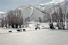 Hazarajat is mountainous,[13] and a series of mountain passes extend along its eastern edge. One of them, the Salang Pass, is blocked by snow six months out of the year. Another, the Shibar Pass, at a lower elevation, is blocked by snow only two months out of the year.[14] Bamyan is the colder part of the region, with severe winters.[15]
