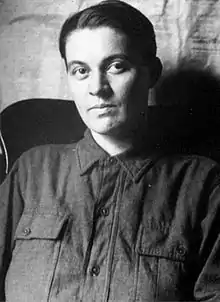 When her husband was sent to France on the first American contingent to fight in World War I, she first tried to join the Red Cross in Douglas, but was not accepted.[5] Carter then cut her hair short and stole an Army uniform.[6] She boarded the same train as the one carrying her husband and went undetected for two days when she was forced off the train and told to go back to Douglas.[7][5] However, she got back on the train.[6] At the port, she was able to get onto a ship and stow away.[5] Carter claims her husband did not know of her presence on the train until they neared Chicago.[8] The contingent was five days at sea when her identity was revealed.[4] Her voice was what eventually gave her away and Captain Eugene D. Rideout, realized that she was a woman.[7] Upon arrival on the shores of Europe, she was not permitted to disembark from the ship's deck.[8]