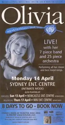 The Heartstrings World Tour is the twelfth concert tour (and third world-tour) by British-Australian pop singer Olivia Newton-John. It began in 2002 and went through until 2005, with shows in North America, Australia and Japan during that time, she supported the three Newton-John albums (2), Indigo: Women of Song, and Stronger Than Before.