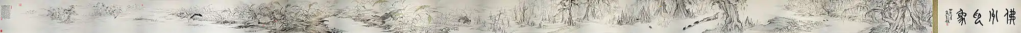 Besides manipulating perspectives, it is also known that Heaven Style painting uses different granularities of strokes and lines to depict different levels of object details. It mimics digital camera’s zoom-in and zoom-out functionality in taking video. This approach was applied in panorama long scroll painting to express both the micro and macro aspects. A representative work is panorama scroll "Florida Impression"(佛州印象), created by Shaoqiang Chen.[7][8] Another feature of Heaven Style painting is that it tries to integrate Western painting technique in using color, such as contrast and color thickness.[6] Some examples are "Blossom of Hydrangea"(绣球花开) created by Shaoqiang Chen,[9] "Delight with the Red"(老来红) created by Zhi Chen,[2] etc.