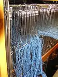 A heddle is an integral part of a loom. Each thread in the warp passes through a heddle,[1] which is used to separate the warp threads for the passage of the weft.[1][2] The typical heddle is made of cord or wire and is suspended on a shaft of a loom. Each heddle has an eye in the center where the warp is threaded through.[3] As there is one heddle for each thread of the warp, there can be near a thousand heddles used for fine or wide warps. A handwoven tea-towel will generally have between 300 and 400 warp threads[4] and thus use that many heddles.