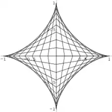 The support function describing the supporting lines for a convex set is defined by . The hedgehog of the support function of any strictly convex set is its boundary, parameterized by the angle of its supporting lines.[4] When a convex set is not strictly convex (it has a line segment in its boundary), its support function is continuous but not continuously differentiable, and the parametric equations above jump discontinuously across the line segment instead of defining a continuous curve, so it is not defined as a hedgehog. The astroid provides an example of a non-convex hedgehog.[5]