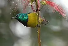 The name Hedydipna comes from the Greek hēdudeipnos, meaning "dainty-supping" or "sweet-eating" — a reference to the nectar sipping habits of these species.[2] These sunbirds are largely restricted to Africa and western islands in the Indian Ocean, though the Nile Valley sunbird is found as far east as Yemen.[3]