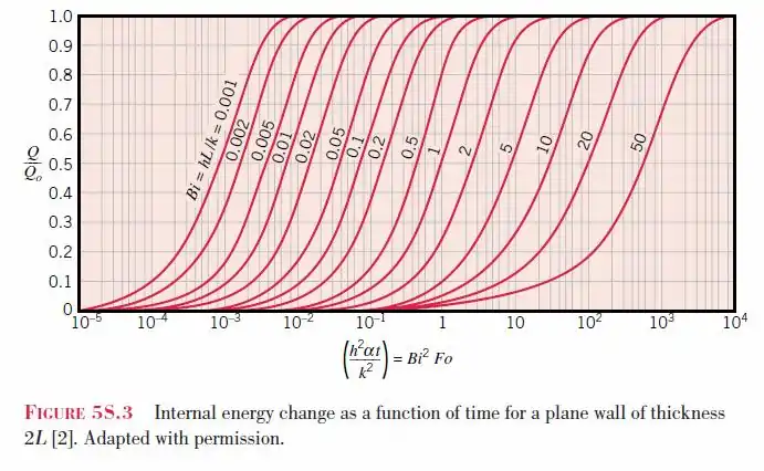 The third chart in each set was supplemented by Gröber in 1961 and this particular one shows the dimensionless heat transferred from the wall as a function of a dimensionless time variable. The vertical axis is a plot of Q/Qo, the ratio of actual heat transfer to the amount of total possible heat transfer before T = T∞. On the horizontal axis is the plot of (Bi2)(Fo), a dimensionless time variable.