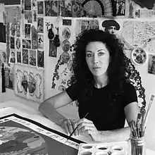 In 2001 she took time away from the business to concentrate on art. "Friends and Icons"[7] was her one-woman art exhibition, curated by Laura Parker-Bowles. David's fashion and textile work is part of permanent collections in the Victoria and Albert Museum,[8][9] the Museum of London[10][11][12][13] and the Art Institute of Chicago.[14]