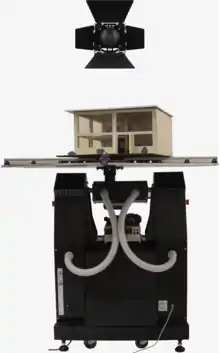 Manual Tabletop heliodons are used for sun shading analysis at any given latitude and at any time. The model support platform is mounted on a conventional table or desk. It can rotate and tilt a scaled architectural model.[9] These heliodons are manually operated without the use of computers and provide good accuracy. The model stand, mounted on the table, is tilted for latitude and rotated to get the time of the day.[9] For replicating the time of the year, the single light source uses a ribbon marked with months of the year and attached to the edge of the door.[9] The device can be used in interior spaces with lamps and exterior spaces with direct sunlight for better accuracy. While using outdoors, a sundial controls the tilt and rotation of the model stand. The main advantage is its affordability and small size.[9] The heliodon is accurate when utilized by people who are already aware of solar geometry. But not good for learning solar geometry and the basic principles of solar responsive design.[9]
