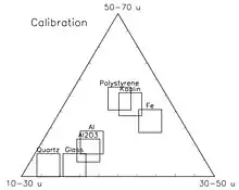 The South sensor was shielded by the spacecraft rim from direct sun light, whereas the ecliptic sensor was directly exposed to the intense solar radiation (up to 13 kW/m2). Therefore, the interior of the sensor was protected by a 0.3 micron thick aluminized parylene film which was attached to the first entrance grid. In order to study the effect of micrometeoroids penetrating the film, extensive dust accelerator studies with various materials were performed.[5] It was shown that the penetration limit of the Helios film depends strongly on the density of meteoroids. Impact experiments with a lab version of the Helios micrometeoroid sensor were performed using several materials at the accelerators at the Max Planck Institute for Nuclear Physics in Heidelberg and at the Ames Research Center, ARC, in Moffet Field. The projectile materials included iron (Fe), quartz, glass, aluminium (Al), aluminium oxide (Al2O3), polystyrene, and kaolin. The mass resolution of the mass spectra of the Helios sensors was low , i.e. only ions of atomic mass unit 10 u could be separated from ions of mass 11 u. These mass spectra served as reference for the spectra obtained in space.[6] Spectra were recorded from 10 u to 70 u. The mean calibration spectra are presented in a three phase diagram: low masses (10 to 30 u), medium masses (30 to 50 u), and high masses (50 to 70 u).
