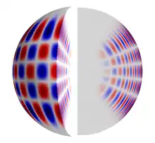 Illustration of a solar pressure mode (p mode) with radial order n=14, angular degree l=20 and azimuthal order m=16. The surface shows the corresponding spherical harmonic. The interior shows the radial displacement computed using a standard solar model.[15] Note that the increase in the speed of sound as waves approach the center of the sun causes a corresponding increase in the acoustic wavelength.