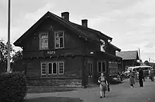 At the time of construction, the railways provided a leap in transport for the communities it passed through. NSB saw beautiful and grand stations as a way to draw patronage, and chose, in addition to impressive architecture, to build a park adjacent each stations.[86] As construction went by, funding for stations were reduced, resulting in less grandeur further north. Most stations had two stories and an attic, although some of the stations serving lesser places had smaller buildings. From Steinkjer to Skogn, the ground floors were built in random rubble. As construction continued, budgets were reduced and station costs were cut. From Rinnan to Sparbu, the ground floors were instead built in brick, and from Mære and north, the stations have wooden ground floors. In addition to a station buildings, stations consisted of an outhouse and a freight house; selected stations also featured a water tower and motive power depot.[85]