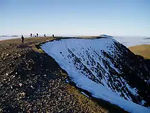 Striding Edge is a notorious accident spot among hikers and scramblers. In winter conditions the climb from Striding Edge up to the summit plateau can involve crossing steep icy ground and a snow cornice, and can be the most dangerous part of the walk. Without an ice axe or crampons this presents a serious obstacle. In January 2008 two walkers died after falling from the ridge in separate incidents.[12] Another walker died after falling from Striding Edge in May 2008.[13] Over the August Bank Holiday weekend in 2017, Patterdale Mountain Rescue attended a fatal fall from Striding Edge on the Saturday and helped rescue a seriously injured walker and his dog on the Sunday.[14][15]