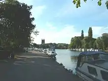 Henley Bridge is a five arched bridge across the river built in 1786. It is a Grade I listed historic structure. During 2011 the bridge underwent a £200,000 repair programme after being hit by the boat Crazy Love in August 2010.[8] About 1 mile (1.5 kilometres) upstream of the bridge is Marsh Lock.[9] Henley Town Hall, which maintains a prominent position in the Market Place, was designed by Henry Hare and completed in 1900.[10] Chantry House is the second Grade I listed building in the town. It is unusual in having more storeys on one side than on the other.[11] The Church of England parish church of St Mary the Virgin is nearby and has a 16th-century tower.[12][13] The Old Bell is a pub in the centre of Henley on Bell Street. The building has been dated from 1325: the oldest-dated building in the town.[14] To celebrate Queen Victoria's Diamond Jubilee, 60 oak trees were planted in the shape of a Victoria Cross near Fairmile, the long straight road to the northwest of the town.[15][16] Two notable buildings just outside Henley, in Buckinghamshire, are: