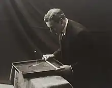 ![]() Devaux demonstrating a thin oil film on water, with toy boat, in 1912 | |