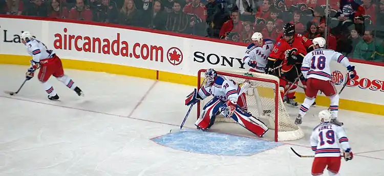 His first career shutout came on 17 October 2005 against the Florida Panthers, only his fifth NHL game, and with it Lundqvist became the first rookie goaltender to record a shutout for the Rangers since John Vanbiesbrouck on 2 January 1985.[10] During the season, Lundqvist also became the first Rangers rookie to post 20 wins in a season since Mike Richter recorded 21 in 1990–91.[11] Finishing the season with 30 wins, Lundqvist broke the Rangers rookie goaltending record of 29 wins, previously held by Jim Henry (1941–42) and Johnny Bower (1953–54). Lundqvist was among the NHL leaders in several categories: fifth in GAA (2.24), fourth in save percentage (.922), 11th in wins (30) and tied for 16th in shutouts with two. However, his regular season success did not continue in the playoffs, where he appeared in three playoff games, posted a 0–3 record, a 4.40 GAA and an .835 save percentage in a series loss to the Devils. He was a finalist for the Vezina Trophy, awarded annually to the NHL's best goaltender, but he was not a finalist for the Calder Memorial Trophy, awarded to the rookie of the year, because of a high quality crop of first-year players.[12] He was named to the NHL All-Rookie Team alongside Sidney Crosby, Alexander Ovechkin, Brad Boyes, Dion Phaneuf and Andrej Meszároš. He won the 2005–06 MetLife/Steven McDonald Extra Effort Award, a New York Rangers team award.
