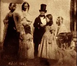 The distinctive curls identify Talbot's half sister Henrietta Horatia Fielding standing to his left. Eliza Frayland, the nursemaid at the far left, had come into the family's employ with the birth of Charles Henry Talbot in 1842. Arranged in the front are Matilda Caroline (later Gilchrist-Clark, age 5); Ela Theresa (age 9); Rosamond Constance Talbot (age 7). The woman at the right is possibly Moore's wife Bessy.[13]