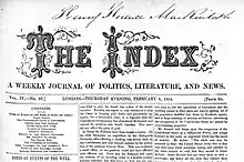 In May 1862, he created a weekly journal, The Index, which was perhaps the best Confederate propaganda activity in Europe. It had a circulation of around 2,000 and was distributed primarily in Britain but was also read in France, Ireland, and even sent back to the Union itself. Hotze's realism and subtlety in his propaganda differed with other Confederate agents in Europe like Edwin De Leon, James Williams, Felix Senac, John Slidell, and Paul Pecquet du Bellet. With a total of sixteen pages, The Index appeared every week on Thursdays. The newspaper cost six pence and thirty shillings for an annual subscription. By the month of July 1864, though sales had been increasing very slowly since 1862, sales revenue of The Index finally became sufficient to amortize the total running costs of the paper.[4] The offices of The Index were located on London's Fleet Street, two doors down from The London American, the official pro-Union propaganda journal.[5]