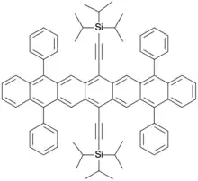 7,16-Bis(tris(trimethylsilyl)silylethynyl)heptacene was synthesized in 2005.[11] This compound is stable in the solid state for a week but decomposes in contact with air. Its synthesis started from anthraquinone and naphthalene-2,3-dicarboxaldehyde. More stable substituted heptacenes have been reported: with stabilizing p-(t-butyl)thiophenyl substituents (Figure 1)[12] and with phenyl and triisopropylsilylethynyl groups (Figure 2).[13]