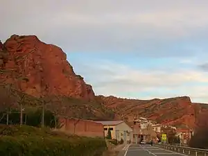 View of Herce and the striking red rock cliffs towering above the town