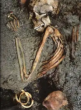 After a period of finds being mismanaged and deterioration of skeletons,[31] further excavations in the 1990s uncovered a 296 skeletons huddled in 9 of the 12 stone vaults facing the sea and on the beach. While the town was almost completely evacuated, these people found themselves trapped. The "Ring Lady" (see image), named for the rings on her fingers, was discovered there in 1982.