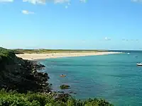 Off the northwestern coast of Herm is the islet of Le Plat Houmet, and beyond that Fondu, which like Herm belongs to Guernsey.[29] In Belvoir Bay on the eastern side of the island are the islets of Mouliere, situated off Frenchman's Point, which is to the northeast of the manor village, and Caquorobert,[30] the latter of which can be accessed at low tide via a vaguely marked path. To the south of this off the southeastern coast is Puffin Bay, which contains the islet of Putrainez near the coast and the islet of Selle Rocque further out to the south.[30] The far southwestern point of the island is Point Sauzebourge, and Bishop's Cove is just to the north of this.[29] North of the cove and south along the beach from the harbour and White House are the Rosiere Steps, with a quarry and cottage of the same name in the vicinity. The Mouette and Percee reefs are offshore here. Hermetier, also known as Rat's Island, lies about 250 m (820 ft) off the western coast between Fisherman's Beach and The Bear's Beach, to the north of the harbour, linked by a low causeway from the beach.[34] The islet can be accessed at low tide from the beach around Fisherman's Cottage.