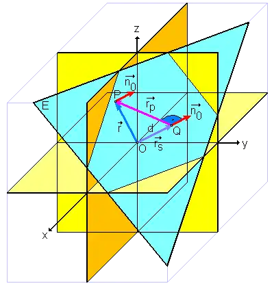 In this diagram, d is the distance from the origin. Because holds for every point in the plane, it is also true at point Q (the point where the vector from the origin meets the plane E), with , per the definition of the Scalar product