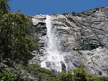 Wapama Falls, at 1,080 ft (330 m), and Tueeulala Falls, at 840 ft (260 m) – both among the tallest waterfalls in North America – are both located in Hetch Hetchy Valley.[8] Rancheria Falls is located farther southeast, on Rancheria Creek.[9] Formerly, a "small but noisy"[10] waterfall and natural pool existed on the Tuolumne River marked the upper entrance to Hetch Hetchy Valley,[11] informally known as Tuolumne Fall (not to be confused with a similarly named waterfall several miles upriver near Tuolumne Meadows). The waterfall on the Tuolumne is now submerged under Hetch Hetchy Reservoir.