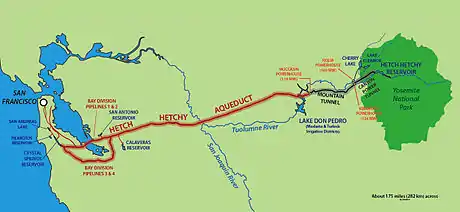 In 1923, the O'Shaughnessy Dam was completed on the Tuolumne River, flooding the entire valley under the Hetch Hetchy Reservoir.[2] The dam and reservoir are the centerpiece of the Hetch Hetchy Project, which in 1934 began to deliver water 167 miles (269 km) west to San Francisco and its client municipalities in the greater San Francisco Bay Area.