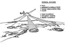In 1983, Lockheed produced A Preliminary Study of solar powered aircraft and Associated Power Trains for the NASA, as long endurance flight could be compared to suborbital spacecraft.[3] In 1984 was published the Design of Long Endurance Unmanned Airplanes Incorporating Solar and fuel cell propulsion report.[4] In 1989, the Design and experimental results for a high-altitude, long-endurance airfoil report proposed applications as a radio relay, for weather monitoring or cruise missile targeting.[5]