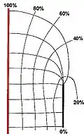 Equipotential lines are shown here, which can be compared with the contour lines on a map of a mountainous region: the nearer these lines are to each other, the steeper the slope and the greater the danger, in this case, the danger of an electrical breakdown. The equipotential lines can also be compared with the isobars on a weather map: The denser the lines, the more wind and the greater the danger of damage. In order to control the equipotential lines (that is to control the electric field) a device is used that is called a stress cone, see figure 3.[10] The crux of stress relief is to flare the shield end along a logarithmic curve. Before 1960, the stress cones were handmade using tape—after the cable was installed. These were protected by potheads, so named because a potting compound/dielectric was poured around the tape inside a metal/ porcelain body insulator. About 1960, performed terminations were developed consisting of a rubber or elastomer body that is stretched over the cable end.[11] On this rubber-like body R a shield electrode is applied that spreads the equipotential lines to guarantee a low electric field.