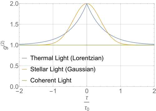 This model fits the observation that was done by Hanbury Brown and Twiss using stellar light as demonstrated in figure 3. If thermal light was used instead of stellar light in the same setup, then we would see a different function for the second order coherence.[5] Thermal light can be modeled to be a Lorentzian power spectrum centered around frequency , which means , where is the coherence length of the beam. Correspondingly, and . The second-order coherence for stellar (Gaussian), thermal (Lorentzian) and coherent light is shown in Figure 4. Note that when stellar/thermal light beam is first order coherent i.e. , the second order coherence is 2, meaning at zero time delay chaotic light right is first order coherent but not second order coherent.[3][5]