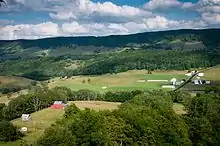 The average elevation of Highland County is 2,832 feet (863 m), which is the 16th highest average elevation among counties in the Eastern United States.[12] The highest elevation in the county is 4,545 feet (1,385 m) in the Allegheny Mountains and the lowest elevation is 1,625 feet (495 m) near the Cowpasture River southwest of Patna.[10][13] The western regions of the county are generally higher in elevation than are the eastern and especially southeastern regions.[14] As the county lies within the Ridge-and-Valley province of the Appalachian Mountains, it features numerous valleys and mountain ridges that are generally oriented in a "northeast to southwest" direction.[13] The valleys are from west to east the Alleghany Valley, the Bluegrass Valley, the Monterey Valley, the Bullpasture Valley, and the Cowpasture Valley.[9][15] The majority of the county and all the southern portions of the county form part of the James River watershed, while northern sections drain into the Potomac River. West of Monterey, the divide is roughly centered along the path of U.S. Route 250; however, in eastern Highland County, the James watershed extends further northward.[13][16]