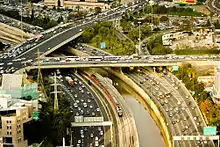 Highway 20, more commonly known as the Ayalon Highway,[1] or simply Ayalon (Hebrew: נתיבי איילון, pronounced: Netivei Ayalon, lit. "Ayalon lanes"), is a major intracity freeway in Gush Dan, Israel. The road runs along the eastern border of central Tel Aviv from north to south (with a planned east-west branch as well) and connects all of the major highways leading to the city—such as Highway 4 from Ashdod and the Southern regions, Highway 2 from Haifa and the Northern regions, Highway 5 from the East, and Highway 1 from Jerusalem and the Southeast. The Ayalon Highway is heavily used; on an average day almost 600,000 vehicles enter the freeway.[2] It consists of a multi-lane highway with a multi-track railway located between the opposite travel lanes. Some of the highway's route is along the Ayalon River, hence its name.