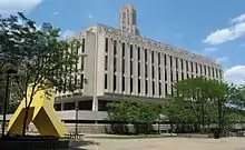 Design of Hillman Library was led by Celli-Flynn and Associates who served as coordinating architects.[13] Kuhn, Newcomer & Valentour served as associated architects with Harrison & Abramovitz acting as consulting architects to the university.[14] Dolores Miller and Associates consulted on the interior design, and Keyes Metcalf served as a library consultant.[15] Construction began in June 1965,[16] and the library opened on January 8, 1968,[17] while its formal dedication was held on September 6, 1968.[18] It is named for John H. Hillman, Jr. Both the Hillman family and the Hillman Foundation gave millions toward its construction. The facade consists of Indiana Limestone alternated with rows of oriel windows, which were designed by Max Abramovitz[19] The building's podium wall is intended to echo the Renaissance-style rusticated stone base of the Carnegie Library across Schenley Plaza.[20] The interior was modeled on the style of Mies van der Rohe with warm teak and black-metal framing.[20] Floor-to-ceiling windows that were placed at a bay window angle in order to be inconspicuous on the plane surface of the outer wall while still providing light.[19] With five floors, seating for 1,539 students, and holding 1.9 million volumes, Hillman is the largest of the 17 libraries on the Pitt campus. In 1996, architect Celli-Flynn and Associates and Kuhn, Newcomer & Valentour won the Timeless Award for Enduring Design from the Pittsburgh chapter of the American Institute of Architects for its design of Hillman Library.[21][22] In 2013, the library began transferring some book collections from Hillman Library to the university's Thomas Boulevard Library Resource Facility in the Point Breeze neighborhood of the city in order to make room for renovations that will add additional seating and group-study rooms to the library.[23] In addition, in the Fall of 2013, the library expanded its hours so that it will be open around the clock from Sunday morning to Friday night.[23] Hillman Library is currently undergoing a phased floor-by-floor renovation with an estimated total project cost of $60 million to $100 million.[24]