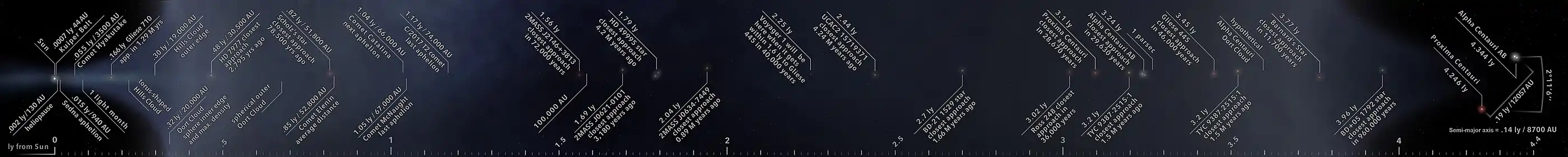 Schematic view to scale of known astronomical objects within 4.5 light years of the Sun. The Hills cloud is shown here as an aqua green line (cross-section of its torus shape).