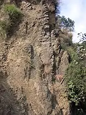 The Lower Siwalik is the base of the Siwalik Group. Deposition of the Lower Siwalik started in the Middle Miocene.[22] The Lower Siwalik is characterized by alternating facies of sandstone and mudstone, deposited in fluvial and floodplain environments.[23] Paleosol deposits are commonly interlayered with sandstone lenses on the scale of >1 m to 10 m.[23] The Lower Siwalik is conformably overlain by the Middle Siwalik.