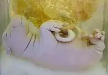 Hippo skin is 6 cm (2 in) thick across much of its body with little hair.[34][37]:260 The animal is mostly purplish-grey or blue-black, but brownish-pink on the underside and around the eyes and ears.[37]:260 Their skin secretes a natural, red-coloured sunscreen substance that is sometimes referred to as "blood sweat" but is neither blood nor sweat. This secretion is initially colourless and turns red-orange within minutes, eventually becoming brown. Two highly acidic pigments have been identified in the secretions; one red (hipposudoric acid) and one orange (norhipposudoric acid), which inhibit the growth of disease-causing bacteria and their light-absorption profile peaks in the ultraviolet range, creating a sunscreen effect.[40][41] Regardless of diet, all hippos secrete these pigments so food does not appear to be their source; rather, they may be synthesised from precursors such as the amino acid tyrosine.[41] This natural sunscreen cannot prevent the animal's skin from cracking if it stays out of water too long.[42]