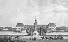 Hirschholm Palace was built on a site that had been used since the Middle Ages. From around 1100 there was a fortification at site known as Hørningsholm. In 1391 the estate became crown land when Queen Margrete I took possession of the property.[1] At the end of the 16th century Frederik II and Christian IV built a royal hunting castle lodge on the site. The estate, which covered a large area (the present-day municipalities of Hørsholm, Karlebo, Birkerød and a part of Allerød) was called the Noble Estate of Hørsholm (adelsgodset Hørsholm), and was endowed to various noblemen and members of the royal court.[2]